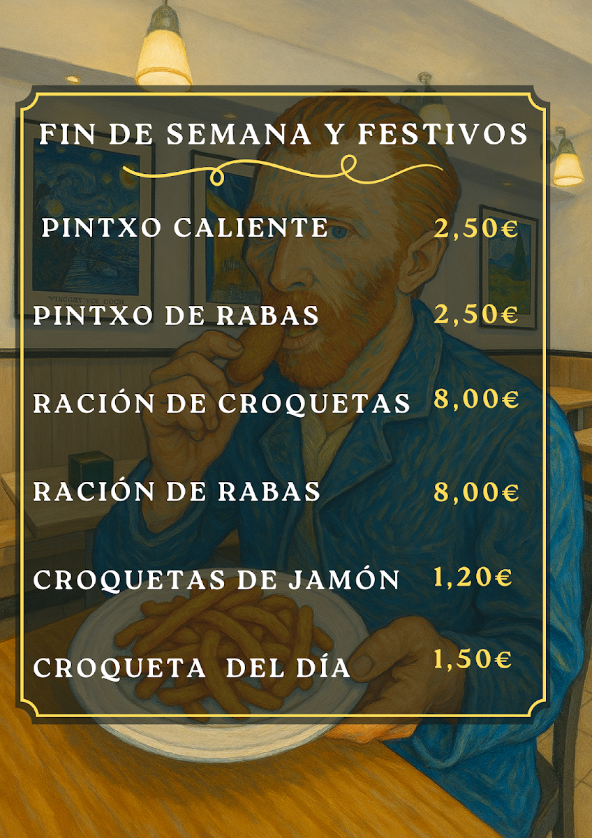 Café Van Gogh offers more than just quality beverages; it serves up a vibrant dining atmosphere accentuated by the warm and welcoming staff, especially under the new management of Mari. Much like the renowned artist for whom it is named, this café thrives on creativity and passion, reflected in every dish and drink they serve. The menu is a celebration of local flavors, with an array of fresh pinchos that tempt your palate. On weekends, don’t miss the hot pinchos—a true crowd-pleaser—as noted by eager patrons eager to indulge.